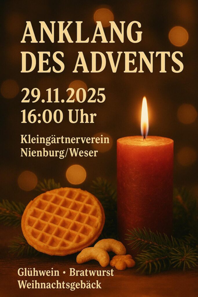 am Samstag vor dem 1. Advent, dem 29.11.2025, seid Ihr herzlich eingeladen, alle zusammen eine schöne Zeit im KGV zu verbringen. Wir werden das Vereinsheim festlich schmücken, ein wenig Süßes und Herzhaftes anbieten und freuen uns einfach auf die Weihnachtszeit.